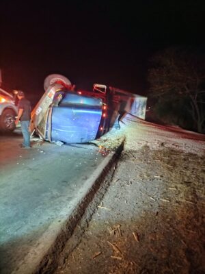 Durante la madrugada de este sábado, brigadistas de Cruz Ámbar Nacional se trasladaron al kilómetro 77 de la carretera federal número 70, tras recibir el reporte de la volcadura de un camión a la altura del ejido Estación Velasco, donde se presumía que el conductor podría estar herido.