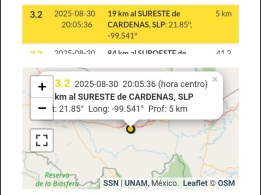 El SSN reportó que a las ocho con cinco de la noche de este sábado 30 de agosto hubo un temblor de 3.2 grados en la escala de Richter en el municipio de Cárdenas, que, aunque es Zona Media, es uno de los municipios cercanos a Tamasopo.
