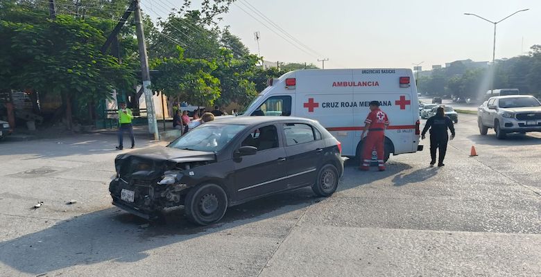 CIUDAD VALLES. Ocurrió un accidente automovilístico en la intersección de la avenida Universidad y la avenida Las Tichas, en el acceso al fraccionamiento San Rafael, que dejó como saldo dos personas con lesiones leves y cuantiosos daños materiales.