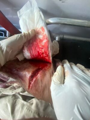 A consecuencia del accidente, el motociclista resultó con una herida grande y profunda en una de sus piernas, quedando tendido a la orilla del camino.