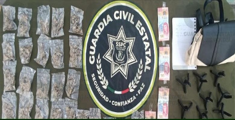 La Secretaría de Seguridad y Protección Ciudadana informó que ambos fueron interceptados en la zona urbana y, al efectuarles una inspección de seguridad, les aseguraron diversas bolsas con marihuana, una hoja de papel con información relacionada con la presunta venta de droga, artefactos conocidos como “ponchallantas”, 500 pesos en efectivo, así como el vehículo en el que se desplazaban.